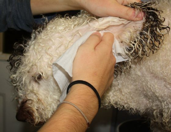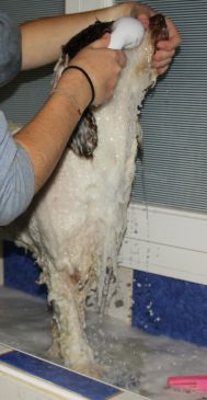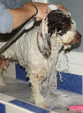 Vous pouvez laver réguliérement votre perro de agua avec un schampoing adapté, surtout ne pas le brosser et le sécher uniquement avec une serviette surtout pas de séche cheveux ! Il existe des shampoing spéciaux couleurs (blanche ou noire )